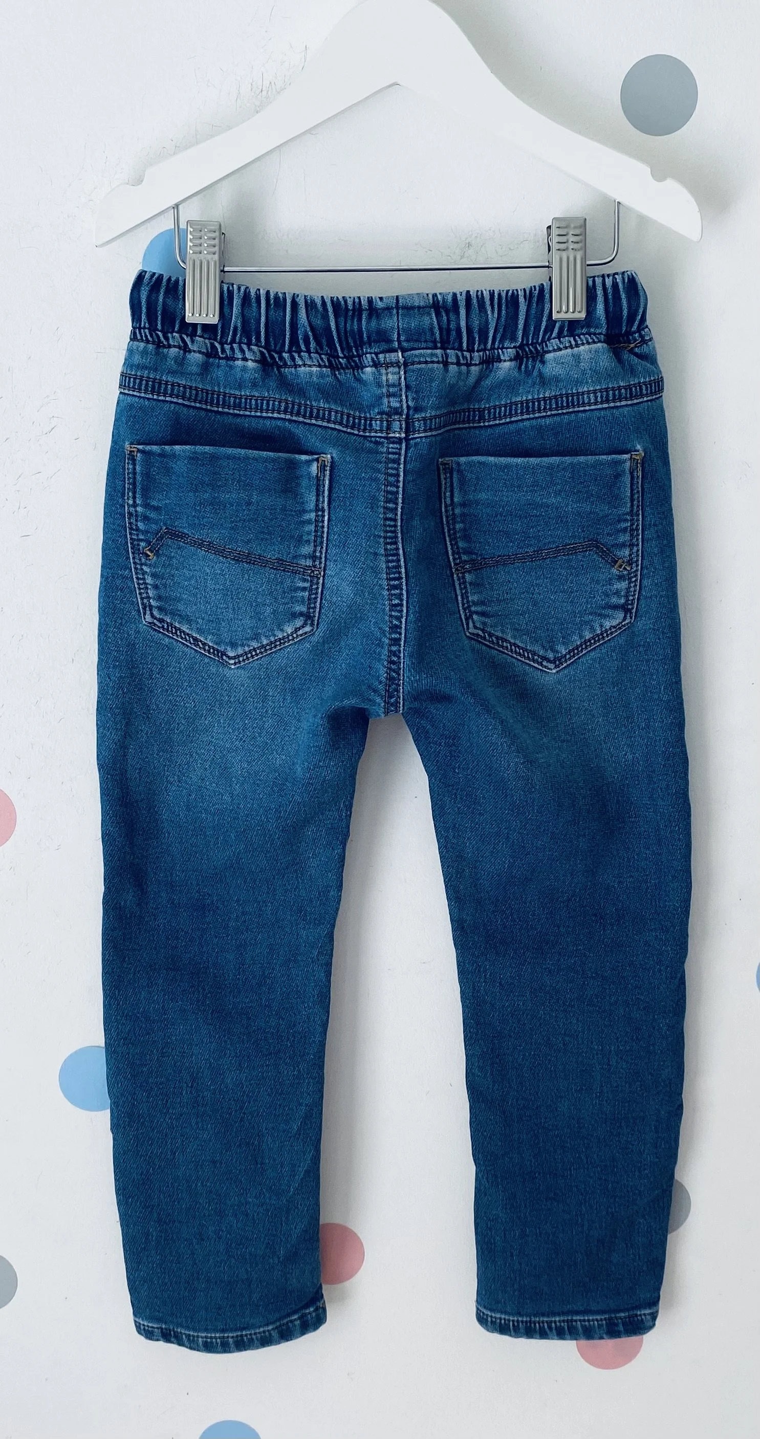 Item Description: Blue, denim jeans with an elasticated waistband and a drawstring detail. With front and back pockets